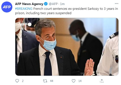 據(jù)法國BFMTV1日報(bào)道,檢方指控稱,薩科齊曾為法官阿齊貝爾提供高薪職位,以換取有關(guān)其非法接受政治資金援助案的內(nèi)部消息。1日,法國巴黎輕罪法庭裁決薩科齊犯有“貪腐”和“以權(quán)謀私”罪,因此判處他三年有期徒刑,其中兩年緩期執(zhí)行。