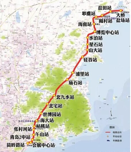 線路起自嶗山區(qū)石老人景區(qū),沿線主要經(jīng)過嶗山金家?guī)X金融商務(wù)區(qū)、李滄東部新區(qū)、城陽東部、即墨東部新區(qū)等區(qū)域,止于即墨汽車產(chǎn)業(yè)城,線路長約48.5公里。