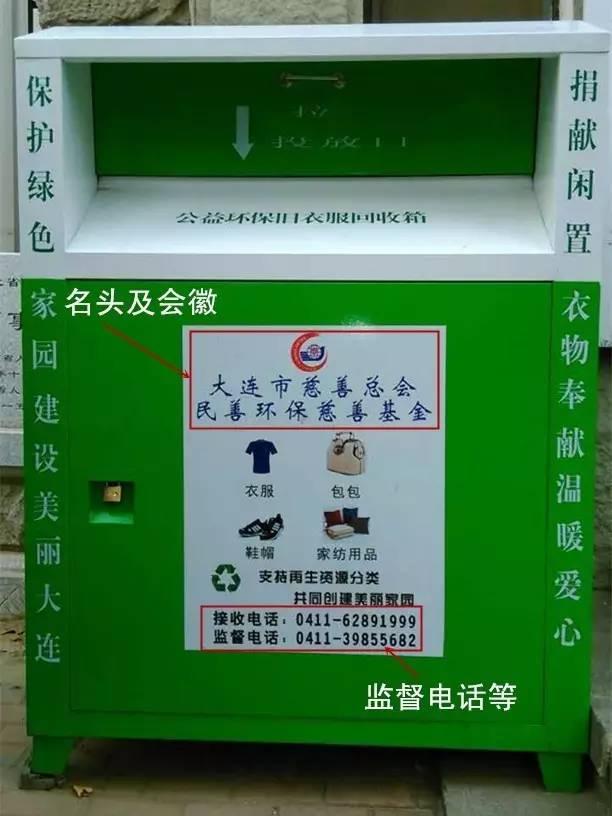 大連市慈善總會(huì)的回收箱,上面標(biāo)有名頭,還有接受電話和監(jiān)督電話。↓↓↓