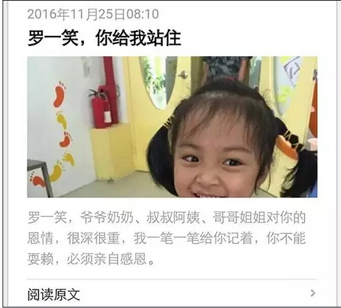 23 日,笑笑病危,住進(jìn)重癥監(jiān)護(hù)室。每天上萬的花費(fèi)讓羅爾第一次感到了恐慌。經(jīng)過反復(fù)思考,羅爾最終選擇了網(wǎng)絡(luò)籌款的方式。于是有了這篇名為《羅一笑,你給我站住》的文章,開始占據(jù)朋友圈。