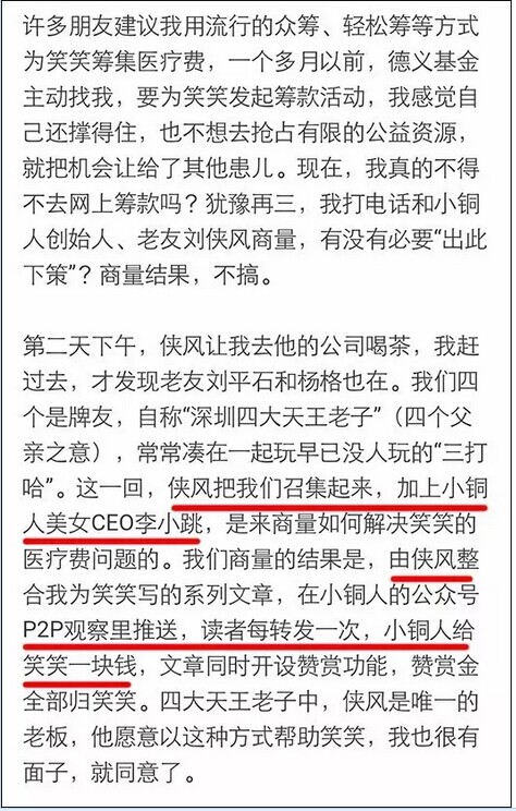 除了用這篇文章的打賞功能籌集醫(yī)療費(fèi),一家名為“小銅人”的機(jī)構(gòu)介入也助推此事變成朋友圈刷屏的熱點(diǎn)。
